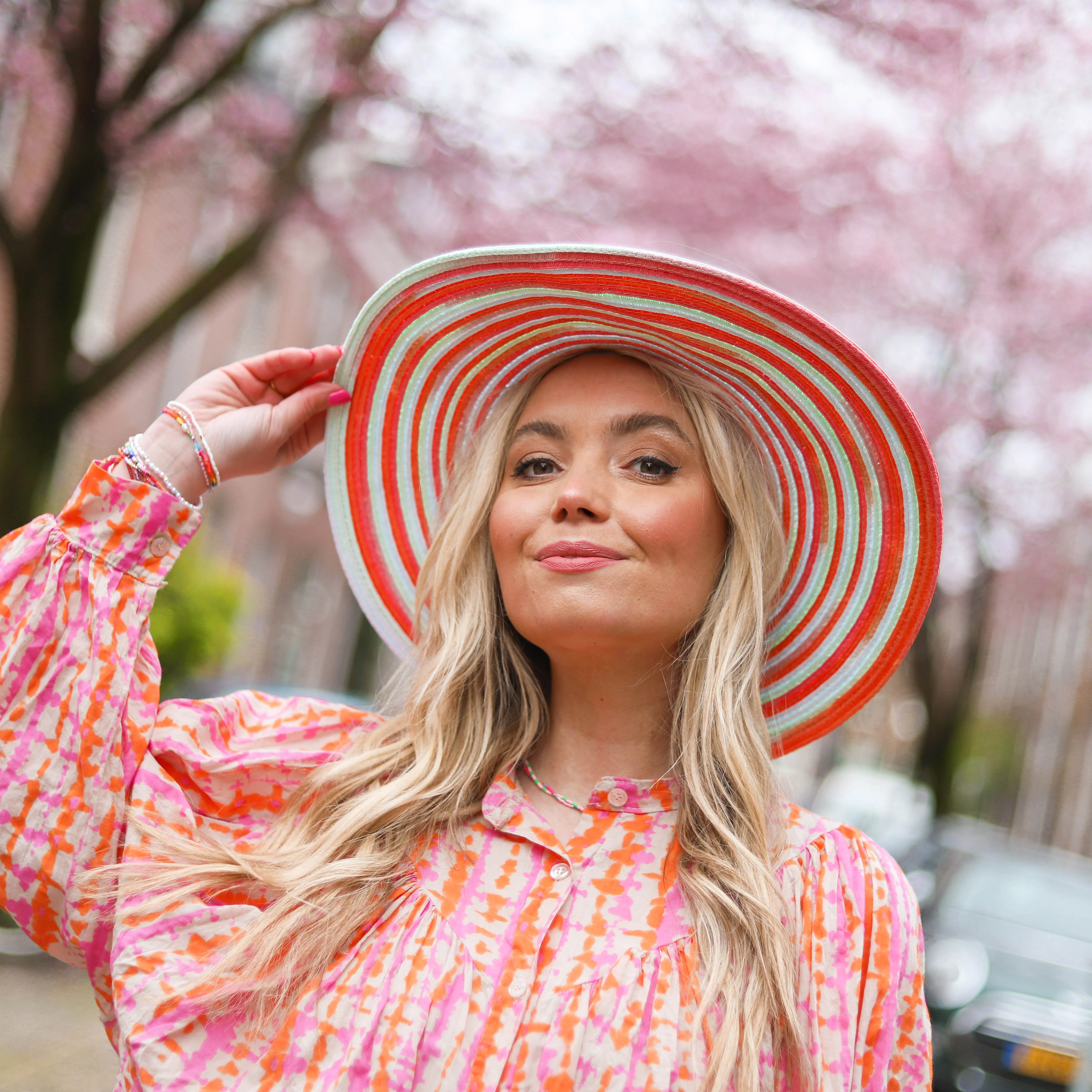 Mooie hoed van stro met oranje details en een gekleurde strepen. Fleurt elke outfit op!