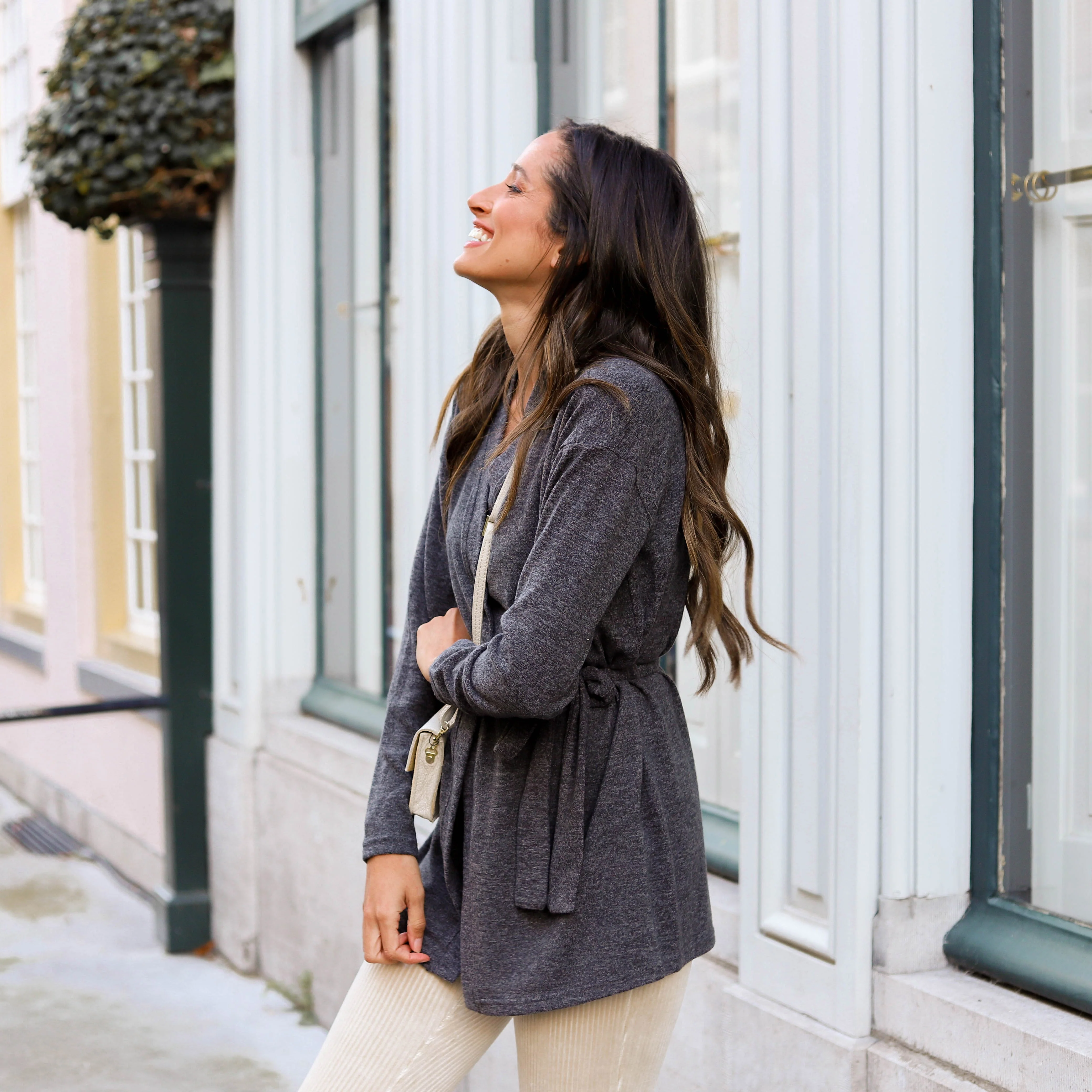 Heel fijn vest in het donkergrijs, zit heerlijk en is te combineren met de bijpassende legging. Het vestje is te strikken in de taille.Â